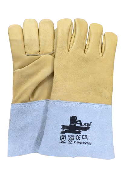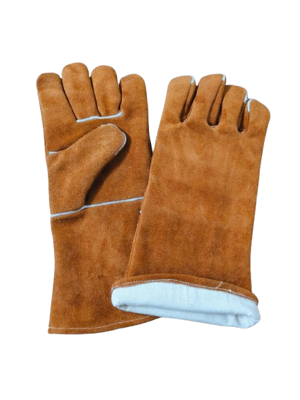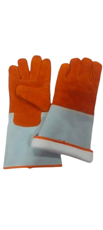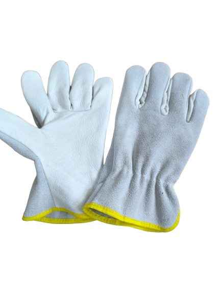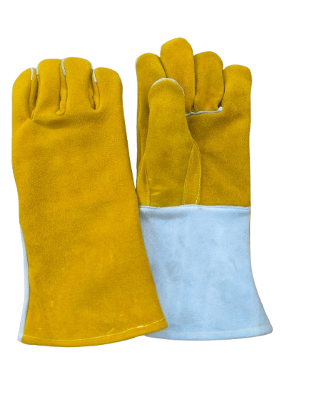 Yellow and White split leather inside: woolen blanket-400GSM Leather thickness: 11/13 Kevlar thumb stiching